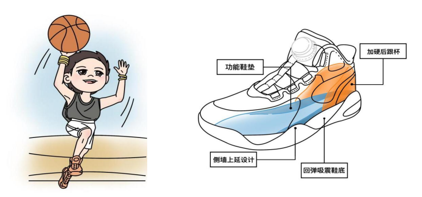 二是篮球鞋。篮球运动对抗性强,运动中常需要快速变向、连续起跳,选鞋时要特别注重足踝保护。有回弹减震的鞋底和侧墙上延纹路设计,配有功能鞋垫及后跟杯加硬设计的篮球鞋,能为运球、起跳、转身提供减震及支撑,降低足踝扭伤风险。